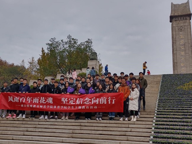 老师和同学们手持鲜花,在雨花台烈士纪念碑前凭吊先烈。学生代表王越和温凯璇在纪念碑前演讲,表达自己对革命先烈的敬畏之情。江子健同学带领同学们进行庄严宣誓,表达自己奉献国家的决心。在教师发言中赵伟健老师指出,革命先烈为了国家民族牺牲的无私、大无畏精神是值得我们学习的。作为一个体育人,我们必须要有坚定的信念和团结的精神,坚定跟党走,团结一心推动体育学院做大做强。努尔老师表示,我们现在所处的是一个和平的年代,都是那些先烈的功劳。我们要严格要求自己,用自己的行动去报效祖国。带队老师和同学们前往烈士就义群雕前进行瞻仰。师生们在“风雨百年雨花魂,坚定信念向前行”的横幅上集体签名,表达自己的爱国情怀和对国家美好的祝愿。