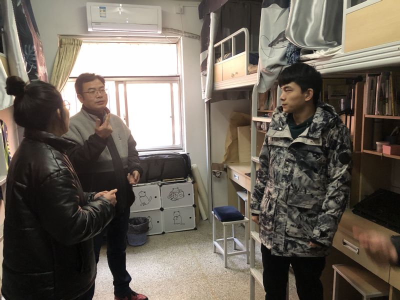 12月15日,美术与设计学院党总支书记赵健、学工办负责人朱思思和2019级辅导员贾凯集中走访该院2019级4栋、5栋学生宿舍。