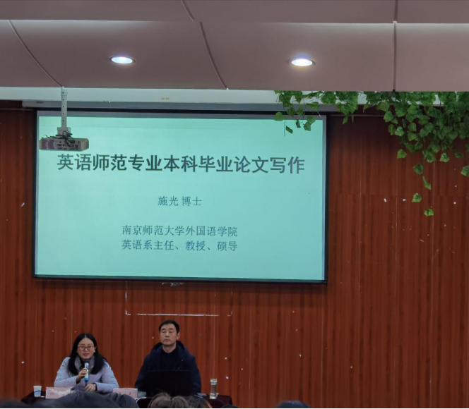 为进一步规范本科毕业论文写作,提高学生论文写作水平,12月15日下午,语言学院邀请南京师范大学外国语学院英语系主任施光教授给英语专业师生开展“英语师范专业本科毕业论文写作”专题讲座。讲座由语言学院副院长徐琴芳主持,英语专业毕业论文指导老师及2017级、2018级学生参加本次讲座。