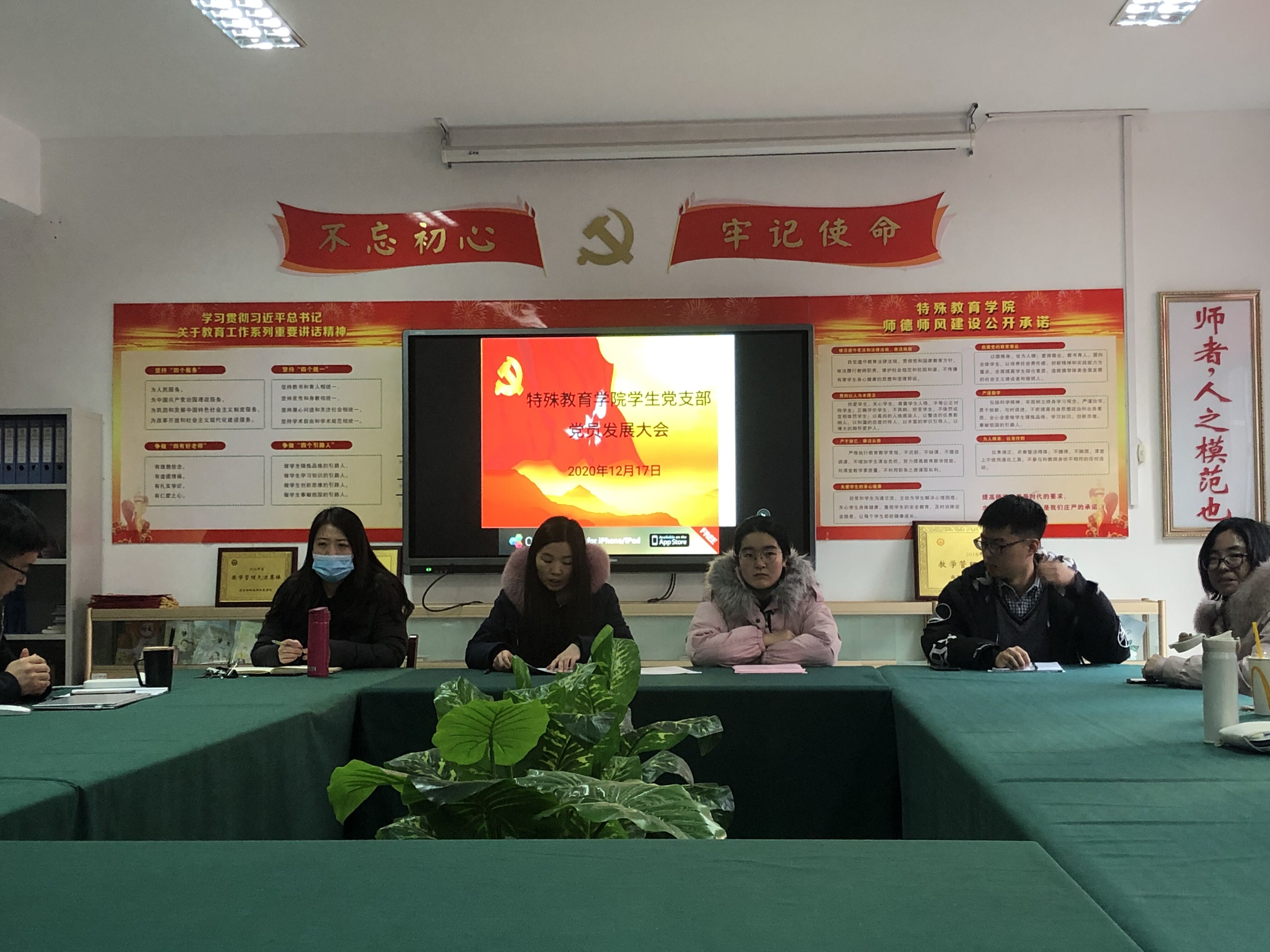 12月17日,特殊教育学院学生党支部召开党员发展大会。会议由该院学生党支部书记邓露主持,党总支书记叶亮、副书记朱玉飞出席,学生党支部全体党员及20名拟发展对象及其入党介绍人参加。