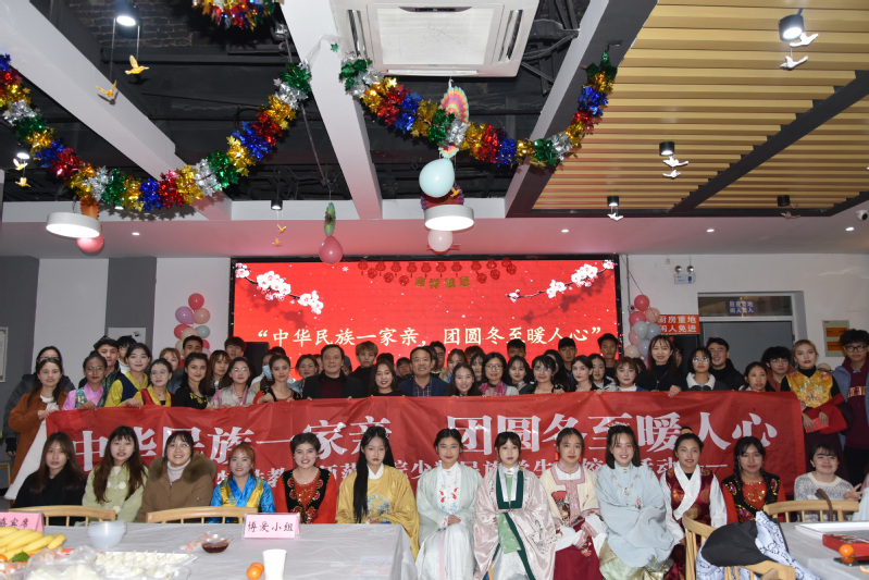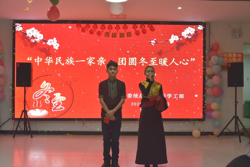 为弘扬中华传统文化,增进民族团结友谊,共迎团圆冬至节日,12月20日下午,党委统战部和党委学工部联合开展了“中华民族一家亲,团圆冬至暖人心”民族学生冬至节日主题活动。党委组织部、统战部部长张金福,党委统战部常务副部长王娟,保卫部部长高飞,学生工作部部长章小军,新疆内派教师秦艳,少数民族专职辅导员努尔比耶姆·麦麦提,以及100名民族学生代表参加活动。
