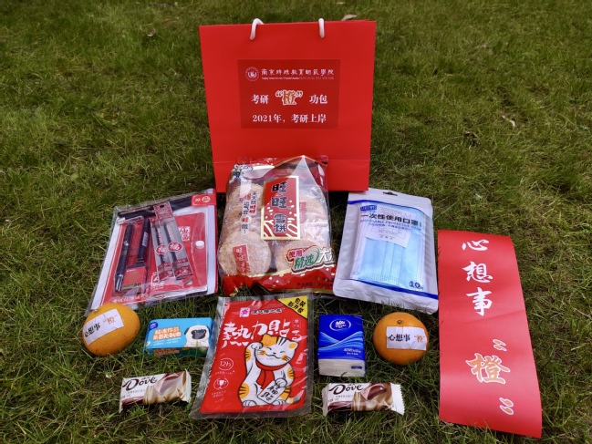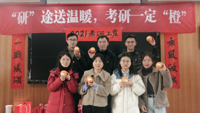 王立新副书记和支部老师们为备考学子们送上充满美好寓意的100份考研“橙”功包。考研“橙”功包里装有备考文具、防疫口罩、巧克力、暖贴,寓意成功的脐橙……等,寄托了学校老师对于同学们爱心满满的祝福。件件贴心的礼物,句句真切的话语,令身处紧张备考的考研学子深切感受到来自学校的关爱与温暖。最后,支部老师们还将亲自提写的祝福对联展示并贴于自习室,祝愿我校学子们考研顺利、金榜题名!