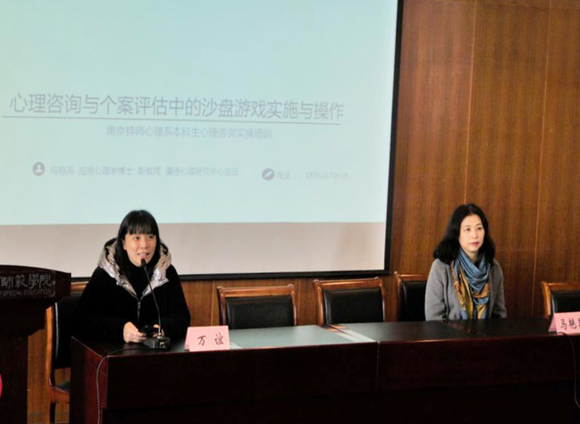 12月28日下午,教育科学学院邀请苏州骥德心理研究中心主任、华东师范大学应用心理学博士马艳英为应用心理学专业、学前教育专业的同学们召开了“沙盘游戏的实施和操作”主题讲座。讲座由学院副院长万谊主持。