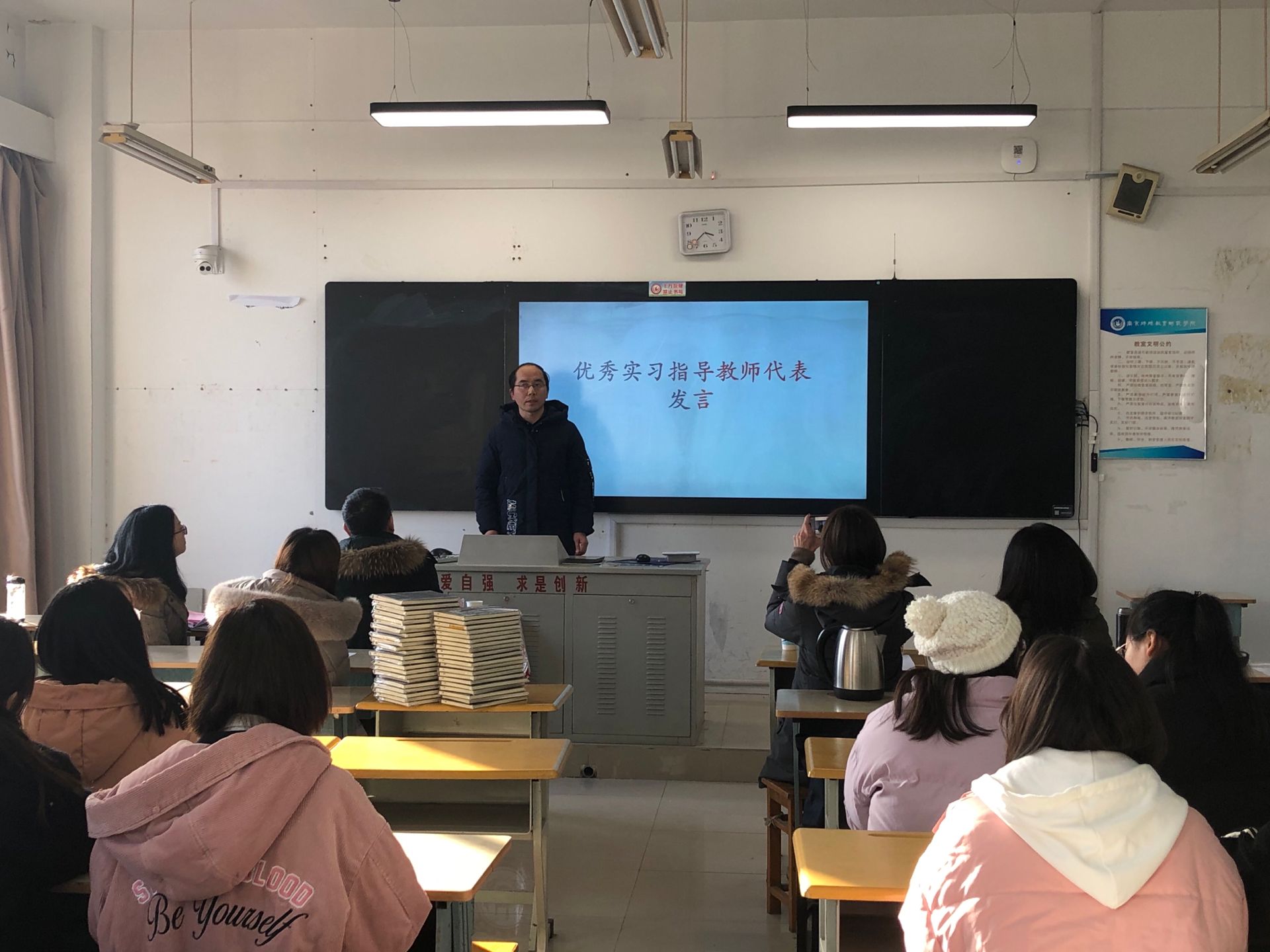 大会第四项是师生座谈交流,优秀实习生分享自己的经验,他们认为在真正融入了实习学校的教学工作之后,和学生们进行无障碍零距离接触,其中的收获颇丰;要注重观察学习老教师的教学设计,学习到如何高效地进行课堂教学;教师个人情感应注入课堂当中,更大可能去满足学生心理需求,用平常心去做好教育工作。优秀实习指导老师代表在交流分享中强调实习的重要性,认为实习对考研考编十分有帮助,同时感谢同学配合带队老师工作。