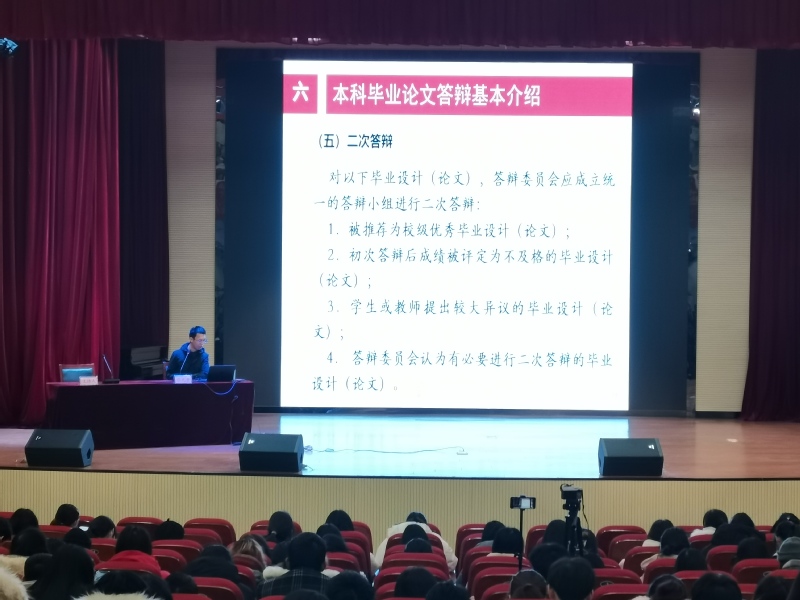 本科毕业论文其他相关问题的讲解上,张九童副院长又简要介绍了毕业论文写作时间表,明确了中期检查、初稿修改和定稿时间,要求同学们在规定时间内完成学校规定的相关任务。特别强调要遵守学术诚信,杜绝抄袭现象,保证查重率在学校规定的范围之内。