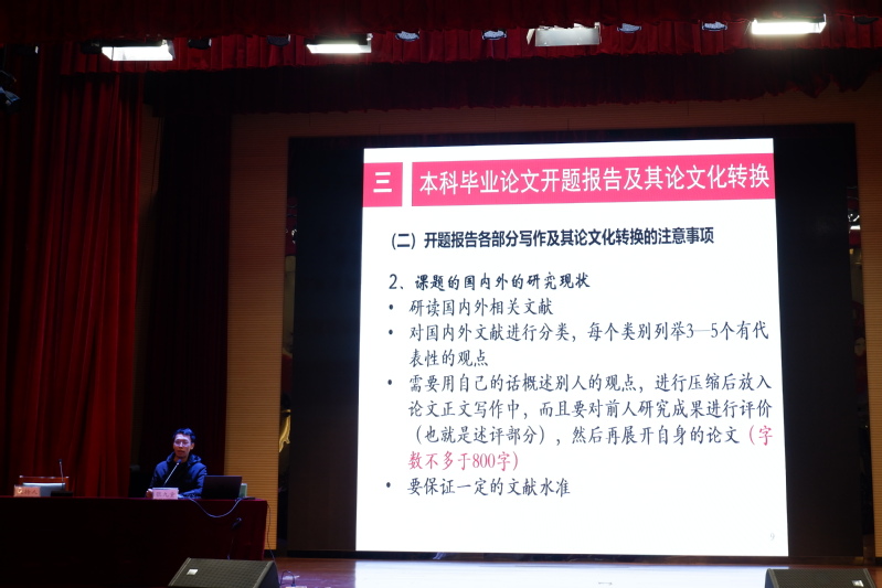 讲座伊始,张九童副院长首先强调了毕业论文写作的重要性,指出本科毕业论文直接关系到学士学位的获取,是对大学四年所学知识及其实践运用的一次综合性检验,引导学生高度重视毕业论文的撰写和答辩。在论文标题拟定上,提出毕业论文的标题应简洁、具体、确切,一定要具有聚焦性,希望同学们切忌反复修改论文题目,坚持围绕既有选题的中心词汇展开论文写作。