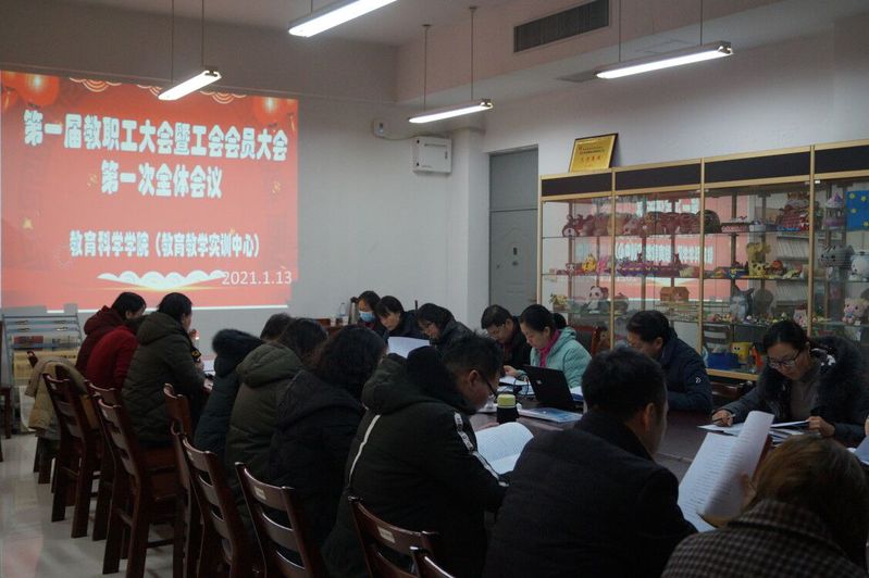 为总结过去,展望未来,1月13日下午,教育科学学院召开了第一届教职工大会暨工会会员大会第一次全体会议。大会由教育科学学院副院长万谊主持,全体教职工参加。