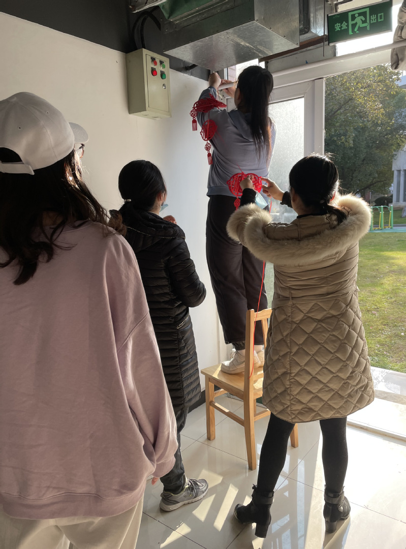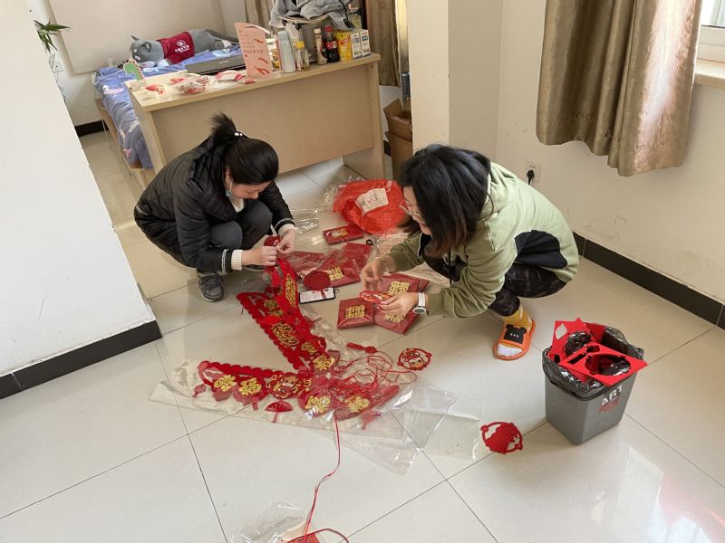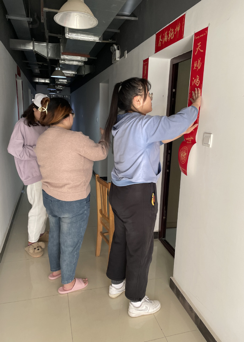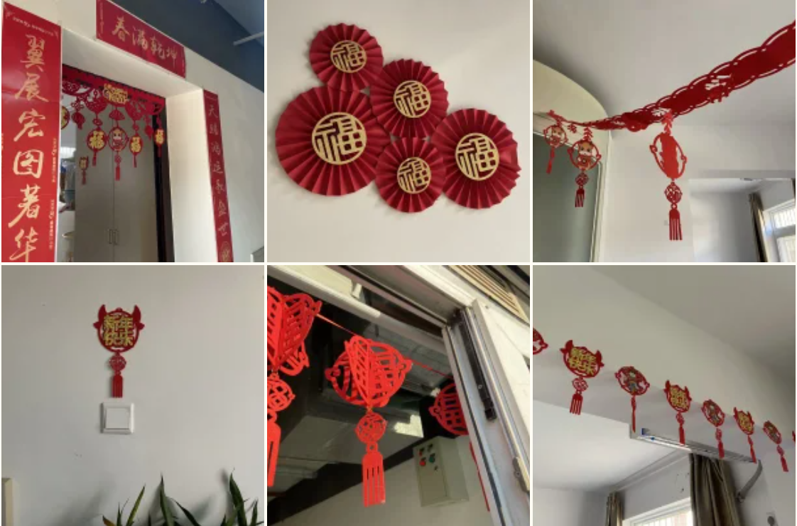 房间内外的福牛春联、窗花、福字……无不喜气洋洋。师生们亲手贴福字、挂立体挂件,过年的仪式感立马充满了整层宿舍,仿佛耳边响起了过年的旋律,热热闹闹、欢天喜地。