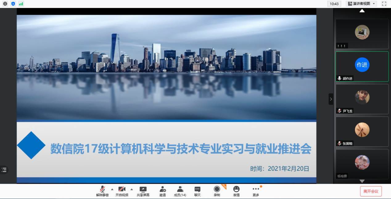 为了进一步推进毕业生就业工作,最大限度降低新冠肺炎疫情对毕业生就业工作的冲击和影响,2月20日上午,数学与信息科学学院在线上召开了2017级计算机科学与技术专业实习与就业推进会。会议由该院辅导员樊琬主持,院长胡作进、党总支书记李宏伟、副院长张居晓以及计算机科学与技术专业系主任蒋贤维和各班学生代表参加。