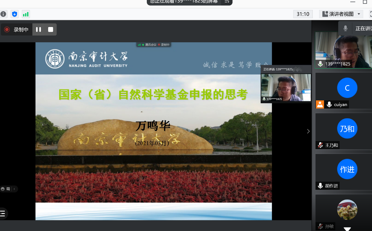 3月3日下午,数学与信息科学学院在新学期第一周举办自然科学基金项目申报经验交流线上分享会,邀请南京审计大学万鸣华博士对国家自科及江苏省自科的申报进行深度刨析。分享会由学院副院长(挂职)崔燕博士主持,该院及学校部分教师参与分享交流。