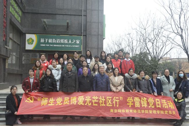 3月5日,是第58个学雷锋纪念日。为了弘扬助人为乐、爱岗敬业、无私奉献、攻坚克难的雷锋精神,让党员师生时刻牢记初心使命,自觉传承红色基因,当好红色传人,管理学院党总支组织该院教师党支部、学生党支部及社工协会的党员师生与燕子矶街道残疾人之家联合开展“学雷锋送温暖”——党员师生博爱光芒社区行主题党日活动。校党委常委、组织部部长张金福,学院党总支书记李固新,院长杨会良,副院长常晓茗、康丽带领全体师生党员、学生干部参加活动,燕子矶街道公共服务科科长崔弘玺、残疾人之家主管贾伟东以及燕子矶街道的残疾人朋友们出席了此次活动。