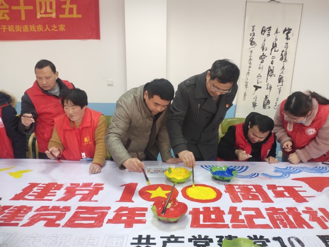 活动以学院师生与残疾朋友共同绘制庆祝建党100周年海报的方式为党的生日献礼。绘画主题为“筑梦新时代,共绘‘十四五’”。在燕子矶街道残疾人之家的书画室中的巨幅画布上面绘有天安门城楼、党旗以及庆祝建党100周年祝福语的轮廓。老师们、同学们与残疾朋友们围绕在画布周围,共同用画笔和颜料一笔一笔为海报涂上颜色。有些残障朋友因为身体原因,无法很稳地握住画笔,老师与同学们便上前扶住她们的胳膊耐心地与她们一起进行绘画。新颖的活动形式极大地调动了大家参与的积极性,经过近半个多小时的努力,一幅多彩的画卷终于绘制完成。大家捧着自己亲手绘制的作品合影留念,记录下这珍贵的一刻。