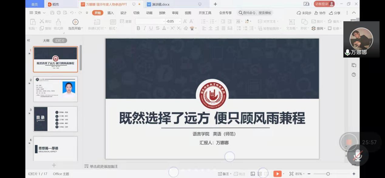 郑丹丹老师介绍了2021年“瑞华杯”大学生年度人物评选工作。经学生自荐、年级推荐,共14名优秀学子脱颖而出。选手们精神饱满,依次汇报了各自入学以来在社会实践、专业竞赛、学术科研、创新创业等方面内容,展现了语言学院学生蓬勃的朝气,彰显了当代青年勇担责任、矢志创新。