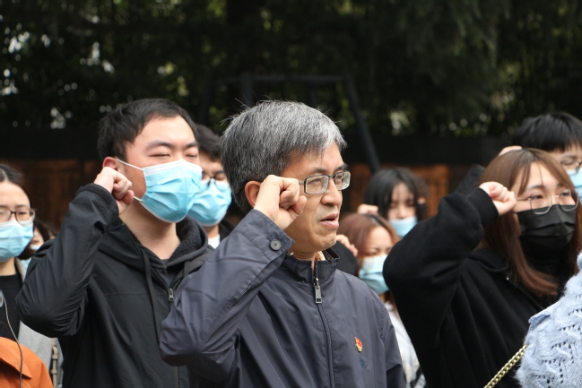 最后,谭忠副校长向同学们做了简短而深情的讲话。他说,今天在这里,我们每一个人都应该记住一个词:责任。我们要用责任的眼光回顾历史,也要用责任的眼光展望未来,这个责任是团结的责任,是富强的责任,也是统一的责任。他勉励同学们要学好专业本领,将来为祖国为民族贡献自己的智慧与力量;每个个人哪怕只是渺小的一点,涓滴汇聚,也会成就一个大写的中国、大写的民族。他寄语同学们将南京特师“博爱塑魂”的精神发扬好,传承好,带到未来的每一天、每一处,不负南京特师人应有的责任与担当。