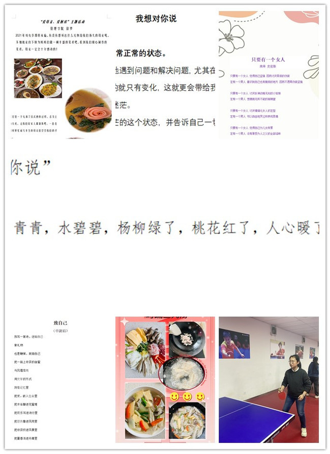 活动以“爱母亲,爱厨房”厨艺展温心、“我健康、我快乐”运动展信心、“我想对你说”文字展爱心、“学党史、读家书”展红心的四个多元化系列版块开展,共同在这个春暖花开的三月见证管理学院巾帼成长风采、呈现学院女教师多方面成果,倾听女性智慧的声音,自觉践行学院院训,创设在工作与家庭联动中的持续学习、终身学习的良好团队氛围。