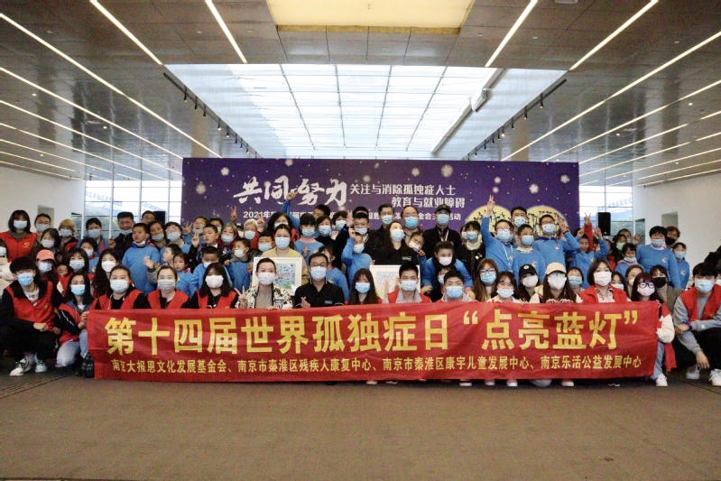 本次活动由南京大报恩文化发展基金会、秦淮区残疾人康复中心(秦淮区康宇儿童发展中心)与南京乐活公益发展中心共同举办,众多孤独症儿童在家长的陪伴下参与了本次活动。志愿者左手系蓝色丝带积极投身与活动之中,在活动开始前陪伴孤独症儿童一起做游戏。活动过程中,志愿者协助展示孤独症儿童的画作,展现出他们眼中那个不一样的星星世界。在孤独症儿童代表与特教老师合作演唱《最好的未来》时仔细聆听他们的心声,感受他们用歌声传递的爱与力量。