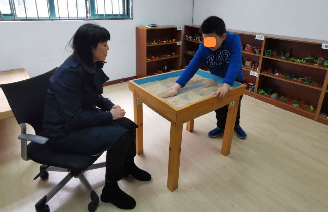 万谊老师(左)为自闭症儿童开展沙盘游戏治疗