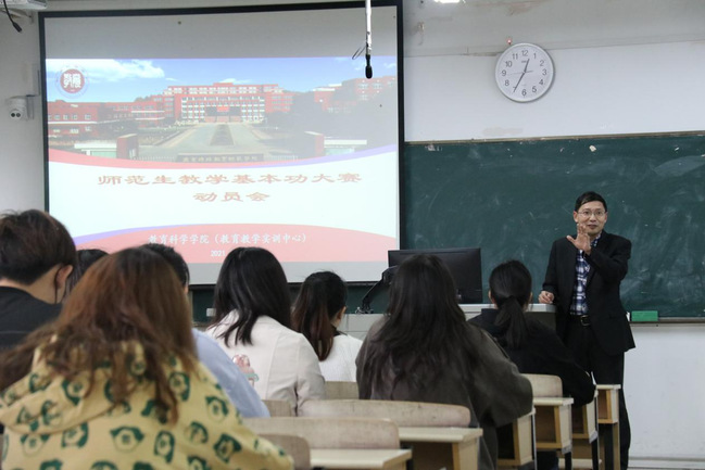 刘新学院长对师范生教学基本功大赛的背景和意义做了阐述,并提出期望与要求,他希望同学们能够放平心态、练好基本功,争做优秀师范生,为学院力争荣誉。万谊副院长传达了师范生教学基本功大赛的活动内容、活动对象、时间安排以及各项比赛的具体要求。