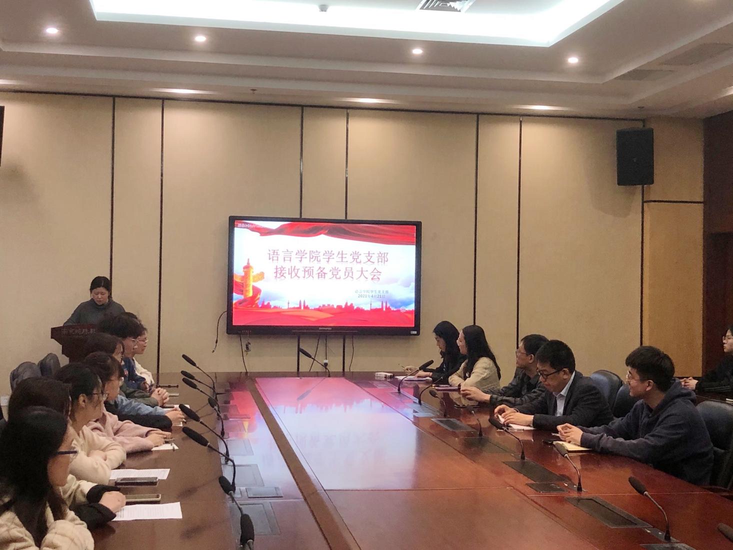 4月21日下午,语言学院学生党支部党员发展大会。会议由学生党支部书记郑丹丹主持,党总支副书记丁祖保,辅导员钱星宇、胡岳、翟玉杨和入党培养联系教师参加。