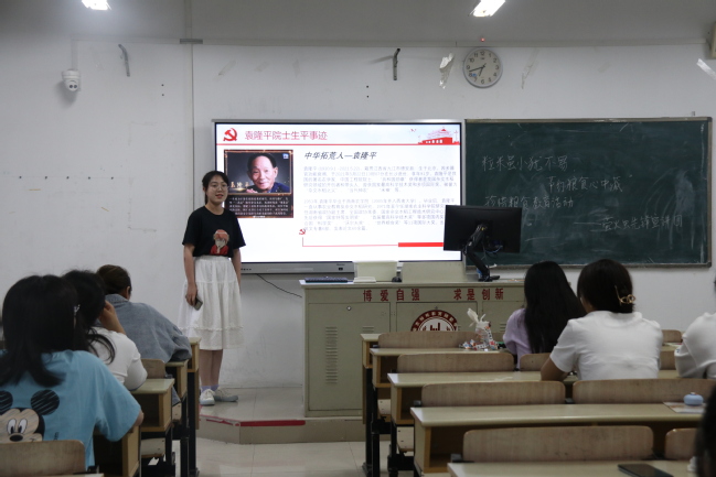 在萤火虫先锋宣讲团成员钱纯的带领下,全体同学为袁隆平院士默哀三分钟。接着钱纯同学通过影像资料和PPT为同学们展现了袁隆平院士的生平事迹。袁隆平院士一生致力于杂交水稻研究,成就斐然,为中国乃至世界粮食安全作出突出贡献。在活动最后,萤火虫先锋宣讲人余彭欣妮通过一系列数据和实例讲述粮食在我们生产生活中所占据的重要地位,进一步使同学们明确珍惜、节约粮食的重要性。致敬袁隆平院士心怀苍生的情怀和勇攀科学高峰的无畏精神。