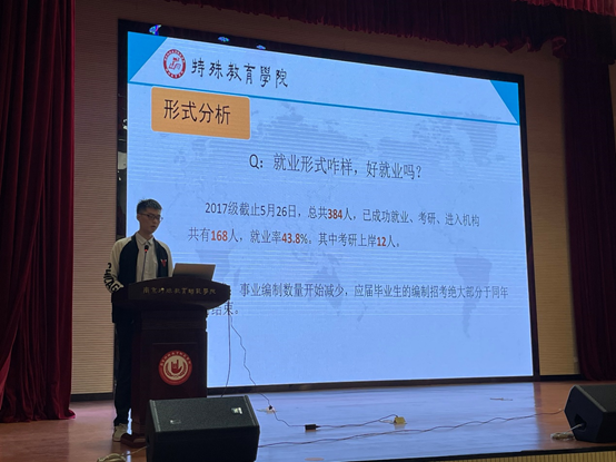 为了更好的指导学院2018级本科生未来的就业工作,提升毕业生就业质量。5月27日,特殊教育学院召开了2018级本科生就业指导暨优秀毕业生经验交流分享会。学院党总支副书记朱玉飞、学工办负责人邸鹏、2017级优秀毕业生代表以及全体2018级学生参加。活动由2018级辅导员王赫煊主持。