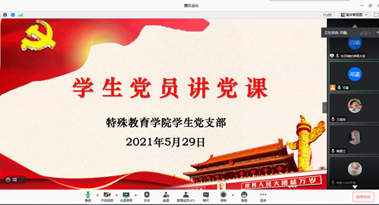 5月29日,特殊教育学院学生党支部线上开展“学习百年党史 汲取奋进力量”学生党员讲党课专题活动,活动由学生党支部书记邓露老师主持,特殊教育学院2017级卓越班班长张百啸同学主讲。
