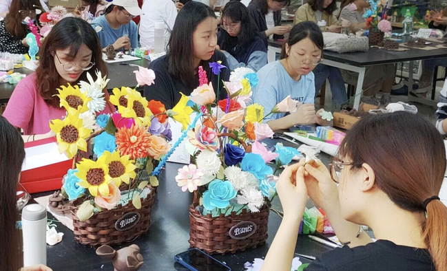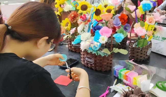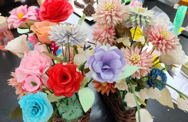 吕艺征老师现场给大家详细讲解了纸花的制作过程和注意事项,学前教育专业的学生党员充分发挥专业特长,利用折纸、皱纹纸和白乳胶等材料,经过剪裁、拧捏和粘贴等工序,一朵朵色彩鲜艳、栩栩如生的花朵就在她们手中绽放了。随后,同学们郑重地将制作好的一束束花插入花篮中,大家借花传情,用实际行动在党的百年华诞之际献上自己的美好祝福。