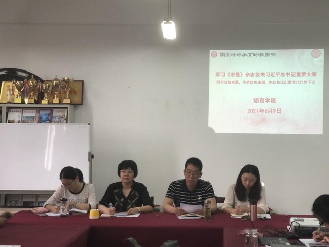 6月9日下午,语言学院党总支召开教职工政治理论学习会,专题学习习近平总书记在《求是》杂志上发表的重要文章《用好红色资源,传承好红色基因,把红色江山世世代代传下去》。
