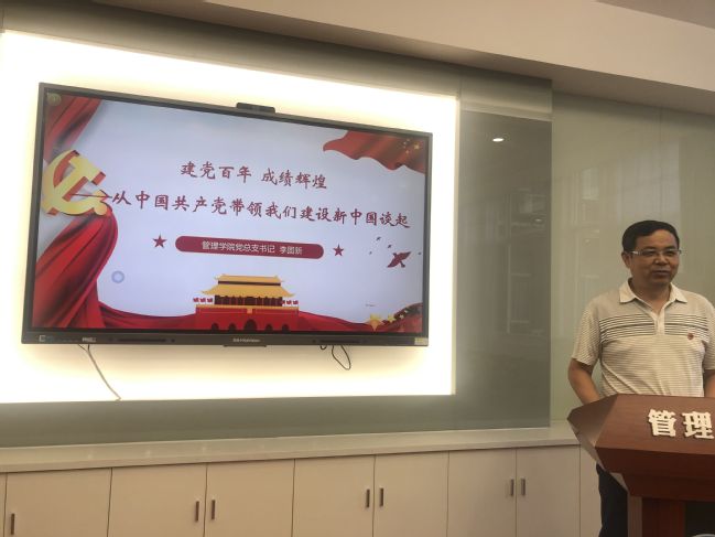 6月16日下午,管理学院党总支书记李固新为全体教师党员讲授题为《建党百年 成绩辉煌—从中国共产党带领我们建设新中国谈起》的党课,全体教师党员参加学习。