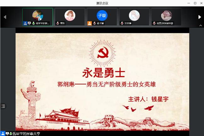 为进一步深化党史学习教育,扎实推进政治理论学习。6月15日晚上,语言学院学工办在线上开展“微党课+云课堂”第三讲:“永是勇士丨郭纲琳——勇当无产阶级勇士的女英雄”。微党课由辅导员钱星宇老师主讲,语言学院学生党员和入党积极分子近两百名学生在线上聆听。