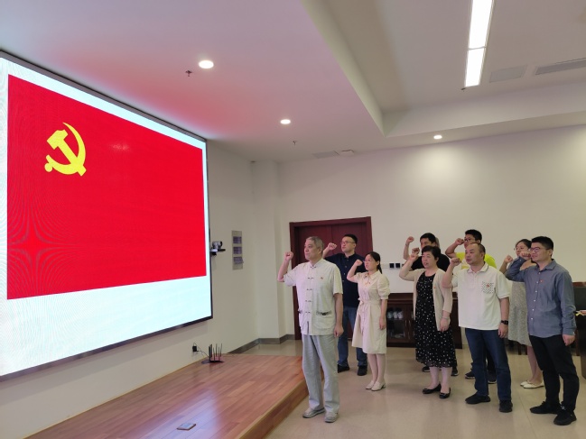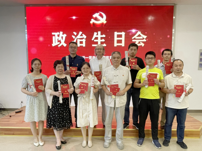“我志愿加入中国共产党,拥护党的纲领……”全体党员面向党旗举起右拳,重温入党誓词。党支部书记向全体党员赠送了特别的“三合一”生日礼物——一张生日贺卡、一份生日报、一本党章。