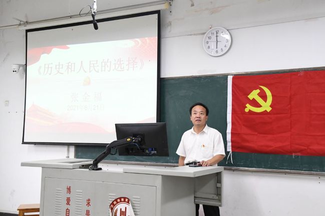6月21日下午,校党委常委、党委组织部部长张金福为管理学院学生党员、入党积极分子以及部分2020级学生讲授了题为“学党史,知党情,跟党走——历史和人民的选择”的党课。