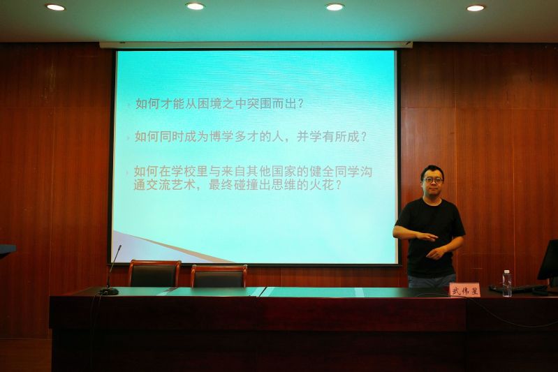 武伟星老师用手语,为同学介绍了他精彩的留学经历。他介绍了自己幼时因高烧失去听力,但坚持接受语言训练,顺利进入普校随班就读,并以优异的成绩考上西安美术学院励志故事。武老师说:“世界这么大,我想去看看。”工作期间,武老师坚定自己的留学梦想且一直为之努力,最终顺利成为一名印度留学的聋人美术研究生。