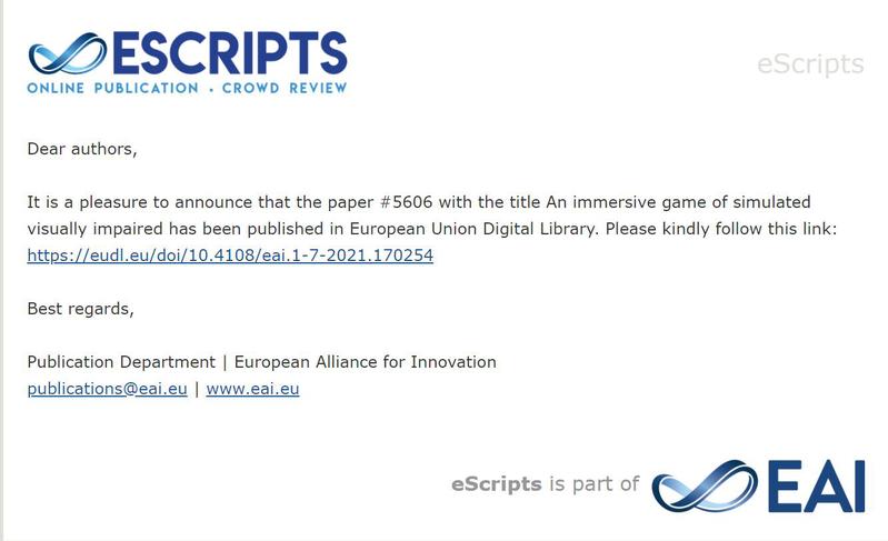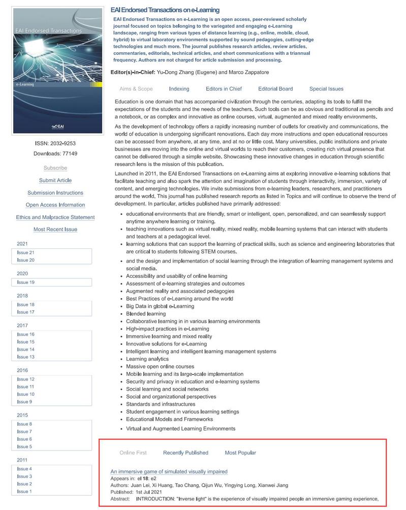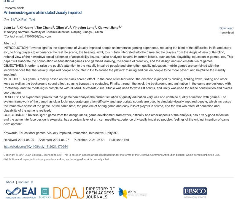 数学与信息科学学院1902班雷娟、黄袭、常涛、龙莹莹、吴其俊等同学,结合学科专业,关爱特殊人群,基于Unity3D平台开发了一款沉浸式体验游戏《逆光》,并撰写论文“An immersive game of simulated visually impaired”发表于欧洲学术期刊EAI Endorsed Transactions on e-Learning。