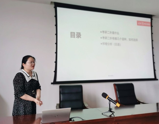 周畅老师针对英语考研以及二外考研问题,分别从招生院校、二外与数学、跨度难度和就业方向等四个方面向同学们描述现实考研经验及教程。周老师阐述了考研现阶段的概况:一是测试考生语言知识和综合百科知识的水平考试,并规划了考研时间轴供同学们参考。同时,她还列举了一系列考试常见的政治、经济、文化和科技方面的词汇翻译。张琛老师针对考研二外主题,分别从考研二外的概述、考研二外的类别及选择的方式和日语样卷的分析这三个方面阐述她对考研二外的理解和解析。在样卷分析时,她对同学们发出提问,并邀请同学们积极互动回答,交流会现场气氛热情高涨。现场同学们认真聆听、埋头记录。