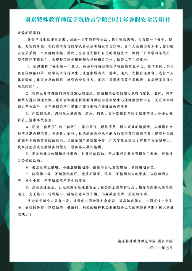 本次走访抽查了学生宿舍4栋和7栋,重点检查学生安全用电情况,排查安全隐患。学院领导走进每间宿舍,告诫学生要安全用电,提高安全意识,必须要杜绝一切违规电器的使用,防患于未然,为自己和他人生命负责。学工办辅导员们表示将继续宣传普及大功率电器使用危害,确保每位同学了解知情。走访过程中发现,大部分宿舍整体卫生状况良好,被褥衣物摆放整齐。许院长提醒同学们要做到勤打扫、勤通风、勤晾晒衣被,不乱拉电线,不违章使用高功率电器的几点要求,提醒离校时插座电源要确保关闭。丁祖保副书记和同学们亲切谈了学习和生活方面的问题,提醒同学们积极营造一个温馨、整洁、安全的生活环境。语言学院学工办制作了《语言学院2021年暑假安全告知书》也通过走访期间的宣传、微信推送、qq群转发等方式再次提醒所有同学务必重视离校安全和假期安全。