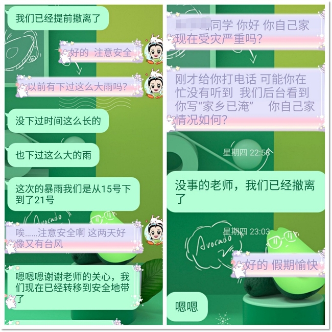 截至目前,语言学院排查了学院21名河南籍学生,详细调查了受灾学生家庭的受灾情况,其中大部分学生无人身安全威胁,有2名学生家中房屋受淹、家中农作物受损等不同程度财产损害。1名学生家庭住处位于泄洪点,举家紧急转移,目前尚无居所。学院通过QQ、微信、电话等方式密切联系受灾学生,时刻关注受灾学生所在区域的灾情变化,尽可能为学生提供帮助。此外,学院还加强资助政策宣传,做好统计与上报工作,帮助受灾学生及时申领临时困难补助。辅导员与班主任积极与受灾学生沟通,简单传授“防水防灾”的安全常识,并关注学生的心理动态,从心理疏导、情感关怀等方面对学生进行全方位的关爱帮扶。