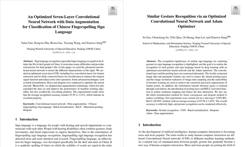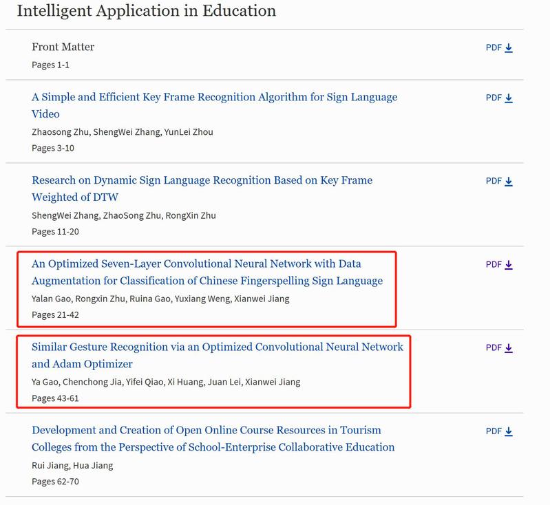 本次会议不仅关注人类教育相关的学习,还特别关注了机器学习技术。数学与信息科学学院学生运用深度学习技术对中国手语识别展开研究,发表了两篇学术研究论文。其中,2018级学生高亚岚、高瑞娜、翁宇翔发表了论文“An Optimized Seven-Layer Convolutional Neural Network with Data Augmentation for Classification of Chinese Fingerspelling Sign Language”,用优化的七层卷积神经网络加数据增强技术来分类识别中国手语手指语。此外,2018级学生高雅、贾成冲、乔懿飞和2019级同学黄袭、雷娟合作发表了论文“Similar Gesture Recognition via an Optimized Convolutional Neural Network and Adam Optimizer”,用优化的卷积神经网络和优化训练算法实习了对相似手势的识别。目前,这两篇论文已经正式上线并出版,将被Ei Compendex, ISI Web of Science, Scopus, CrossRef, Google Scholar, DBLP等多个索引服务检索。