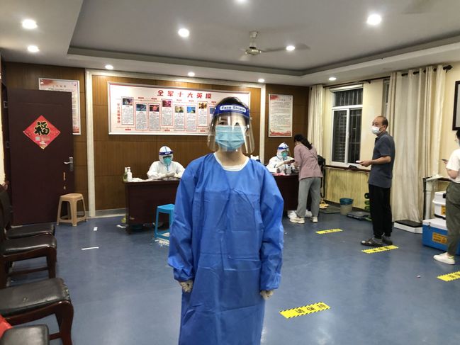 7月29日,陈雅露老师开始了第一天志愿服务工作。早上6点从家出发,6点半到东井村社区核酸采样点,穿好防护服开始上岗。从穿上防护服开始,手机等随身物品不能再随意触碰了,上厕所也不方便了。为了减少进出核酸检测房间,避免更换防护服,一个上午她坚持不喝水、不上洗手间,在采集房间内协助秩序维护。在现场,她主要负责临检居民的准备工作,提醒居民佩戴好口罩、保持间距,帮助老人和其他有需要的居民解决实际问题,配合医务人员完成采样工作。就这样一直工作到晚上7:45,她才从核酸检测采集房间轮换下来。在闷热的防护服里全身湿透,声音也变得嘶哑,双脚也因长时间站立变得肿大酸胀。