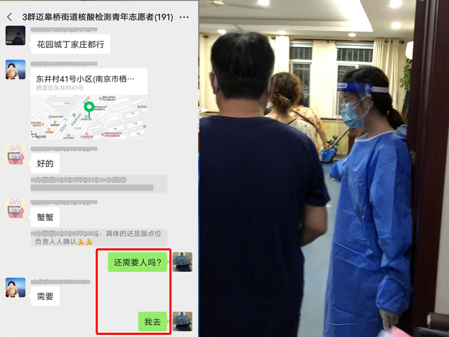 看着南京市迅速启动的一轮轮核酸检测,南京市民纷纷行动起来,陈雅露老师也坐不住了。“我也可以去一线!”她迅速在网站上搜索到共青团南京市委发布的志愿者招募倡议信息,马上留言报名。现在她已经加入了不同区的3、4个志愿者群了。