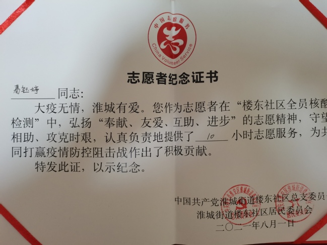 葛钰婷同学是语言1804预备党员,在家乡淮安市核酸筛出阳性病例后第一时间加入到社区的核酸检测志愿者服务中。在7月29日至31日,穿着全套防护服连续3天工作在抗疫一线。在烈日炎炎下工作长达10多个小时,协助淮安市淮安区淮安街道完成了核酸检测工作,以实际行动践行“为群众办实事”的初心和使命。