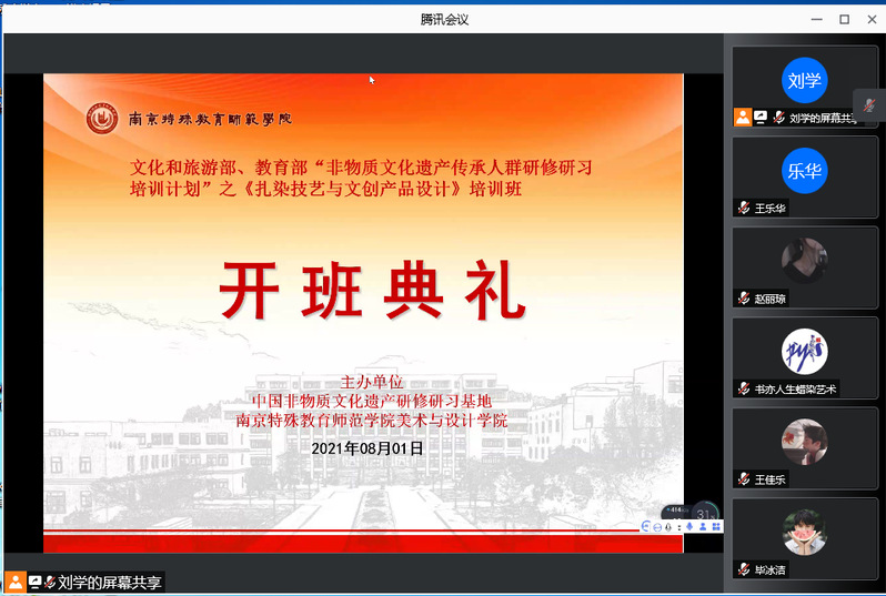 8月1日上午,美术与设计学院承办的文化和旅游部、教育部、人力和社会资源保障部“非物质文化遗产传承人群研修研习培训计划”之《扎染技艺与文创产品设计》培训班在线上举行了开班典礼。典礼由美术与设计学院副院长刘学主持,学院党总支书记、副院长赵健出席。来自相关特殊教育学校的师生、社会手工艺从业者及该院服装专业学生共30名培训班学员参加。