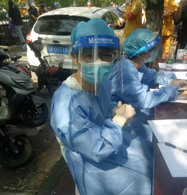 来自数信2004班的王烨民同学是一个地地道道的南京小伙子,他在家乡出现疫情后立即报名成为一名抗疫志愿者,为抗击疫情贡献力量。连续8天时间里,他风雨无阻,帮助老年人在社区组织的核酸检测过程中开健康证明、申请健康码;负责控制社区人员进出、测量体温等事务。在问到这次志愿服务的感想时,他说:“我觉得国家需要我们的时候,我们就该做到牺牲小我,帮助大家。俗话说得好:患难见人心。在这种危难的情况下,更能看出我们的民族凝聚力。众志成城,方能轻松渡过难关!”