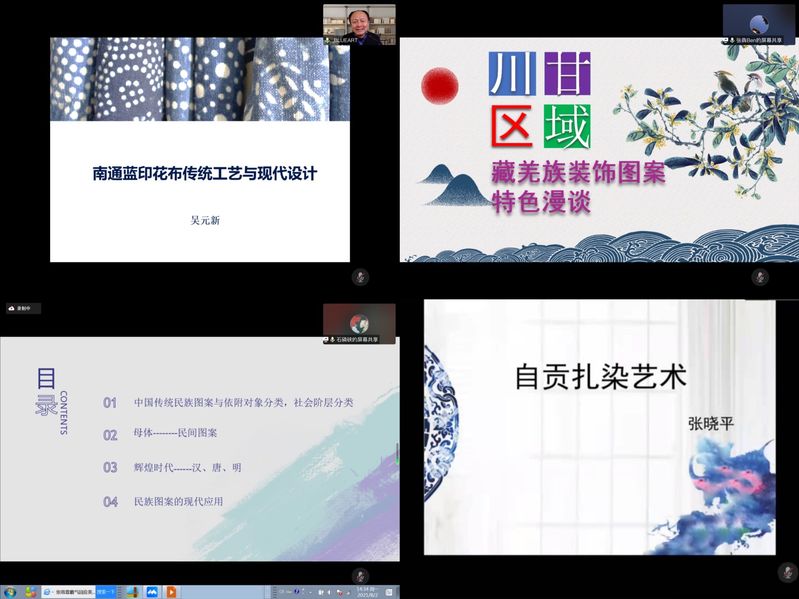 近日,美术与设计学院邀请中国工艺美术大师、国家级非遗传承人、南通大学蓝印花布艺术研究所所长、南通蓝印花布博物馆馆长吴元新开展了“南通蓝印花布传统工艺及现代设计”为主题的讲座;邀请南京师范大学美术学院教授、博导张犇老师漫谈“川甘区域藏羌族装饰图案”特色;邀请南京艺术学院教授、硕士生导师石磷硖作题为“传统图案的时尚应用”的专题讲座。受疫情影响,本次“扎染技艺与文创产品设计”非遗培训讲座以线上的方式举行。