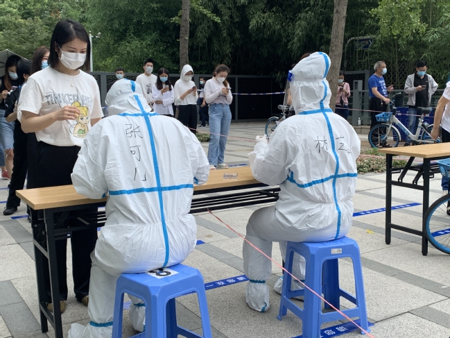 5个小时“桑拿天”下的核酸检测工作,尽管困难诸多,但林芝与其他工作人员始终坚守在工作岗位,在他们的耐心劝导、规范操作下顺利完成了当天的核酸检测工作。织造府广场上,排队检测的人员络绎不绝、秩序井然,白色的防护服、蓝色的手术服、红色的志愿者马甲,白蓝红三色穿梭于人群中,构成了最亮丽的风景线!(文/彭琳 林芝 图/志愿者)