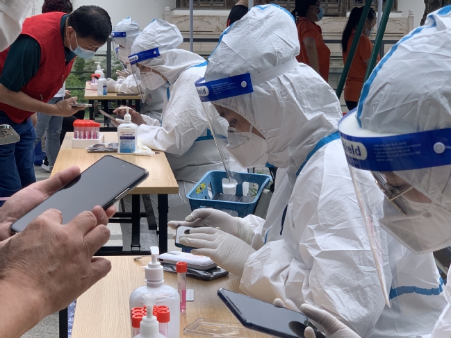 作为负责核酸检测者信息录入的工作人员,林芝本以为相对不复杂,但走上岗位她才发现这项工作并不轻松:戴了两层医用乳胶手套再去操作手机就很不灵敏,难以精准点击到位;信息系统经常发生卡顿,还想办法解决,与此同时也要耐心安抚排队已久的待检群众;烈日当空,在太阳下扫描身份证,经常出现反光不能自动识别身份证上的信息,她只能手动输入身份证号,十分影响录入速度,她只能尽量加快操作速度,不让群众等待时间过长;由于穿着全身的防护服,加上要遵守严格的防护措施,因此工作期间不能多喝水,免得因为个人上厕所面影响检测速度。