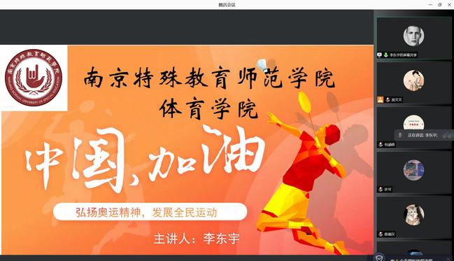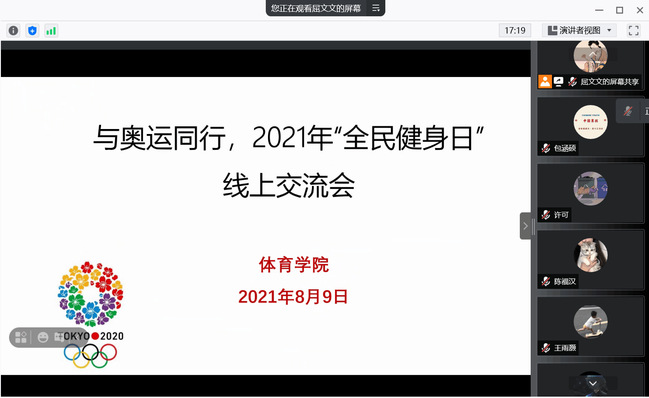 随着东京奥运圣火缓缓熄灭,第32届夏季奥林匹克运动会正式落下帷幕,第十三个“全民健身日”也如期而至。为进一步诠释中华体育精神,营造全民健身的浓厚氛围,8月9日下午,体育学院举办以“全民健身与奥运同行”为主题的线上交流会。体育教育系主任徐五所老师、班主任和辅导员老师、以及全体学生参会。会议由辅导员屈文文主持。