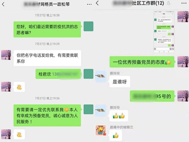 抗洪战斗刚结束,她便投入一线防疫,防疫卡口留下了她忙碌的身影。每天清晨6点不到便抵达社区防疫点,持续工作6小时无休,顶着烈日毫无怨言。她跟随老前辈的步伐认真做好党组织交代的工作:坚守卡口严格排查进出人员、上报可疑人员、测量居民体温、登记外来车辆、提醒居民做好个人防护、为小区居民发放通行证等,即使汗如雨下也在所不惜。自7月底设岗至今20多天已积累超过120小时的志愿服务时长。由于小区靠近制药厂,许多为国家奉献一生的药厂退休人员安居于此,因此小区内的老年人较多。桂君欣同志发扬“博爱塑魂”的校训精神,主动服务有困难的老人,短短几天便为近百位老人申领苏康码、行程码。