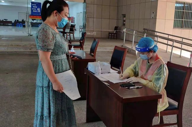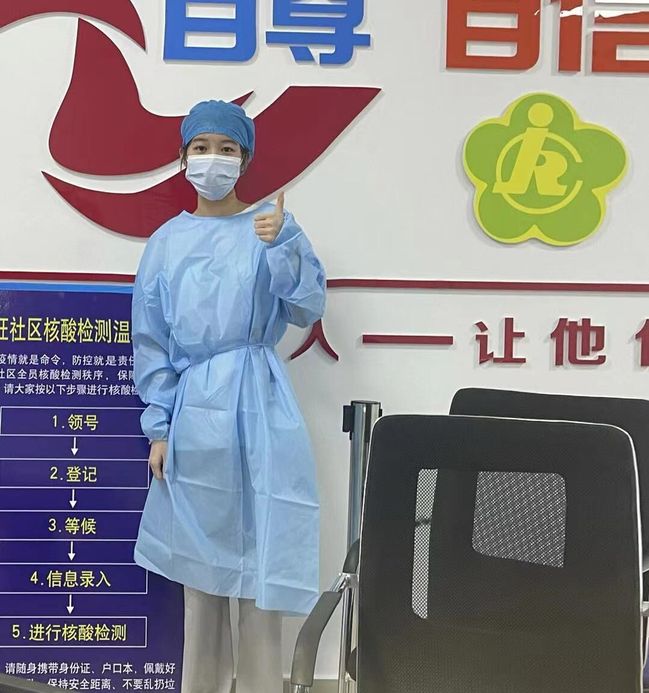 另一位南京姑娘,语言1903班的万娜娜。在7月中下旬第一时间申请加入志愿服务,但因不满疫苗接种两针要求而未被审批。在南京开放疫苗接种后,她再次申请参加一线志愿工作,终于在8月11日正式上岗,负责泰康仙林鼓楼医院入院的体温测量、核酸检测以及挂号缴费服务等工作,志愿时长长达二十多个小时。长时间的站立、防护服的闷热都没有使她退缩,而是一直以热情的态度、细微的服务来引导检测的有序开展,坚持为群众带来最好的服务。