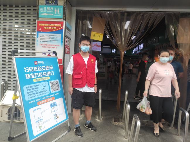 在本次志愿活动中,赵乾龙同学志愿参加了农贸市场的进出口扫码志愿服务。在农贸市场的志愿服务中会遇到很多不会使用手机的老年人,赵乾龙会耐心地帮助他们申领安康码,呼吁他们积极配合市场疫情防控工作。赵乾龙同学表示:“农贸市场每天的人流量都很大,在入口处严把进入的人员,这不仅是对疫情防控的负责,更是对每一个进入市场人员的负责。”